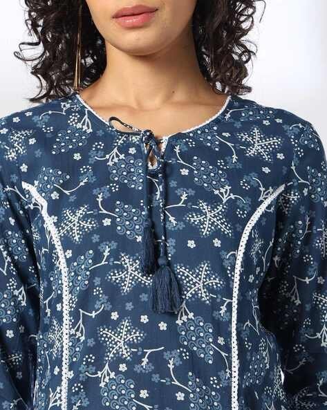 Women Printed Straight Kurta with Neck Tie-Up