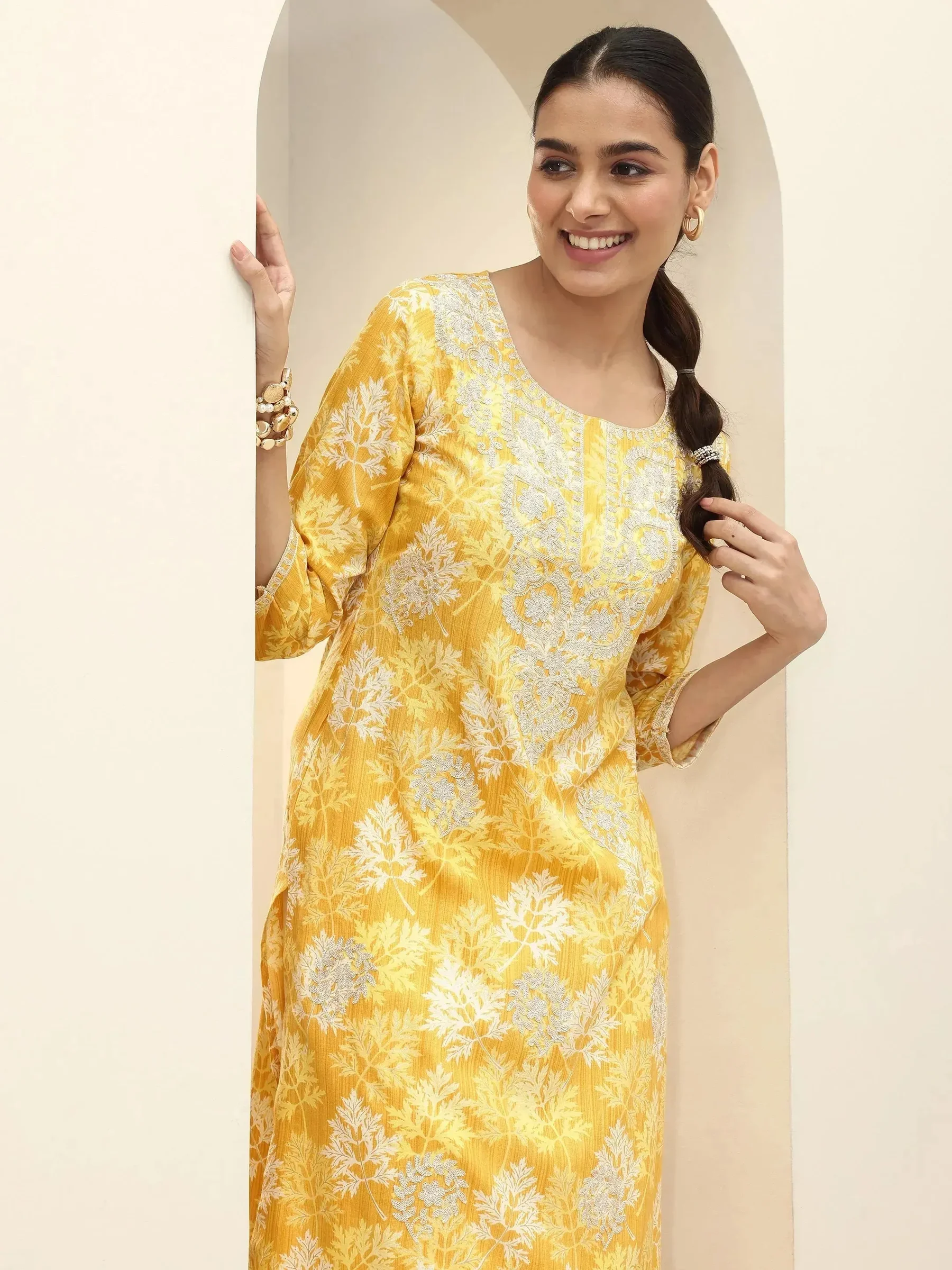 Yellow Printed Cotton Straight Kurta